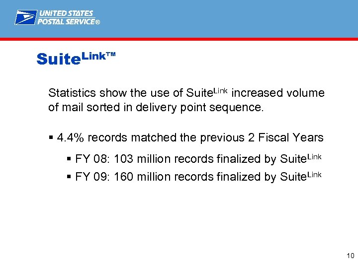 ® Suite. Link™ - What Is It? § Suite. Link candidate records are records where there is a known secondary deficiency. § All CASS™/MASS™ certifications require the use of Suite. Link to append suite numbers where match available § Usage mandatory for all end users in production 9