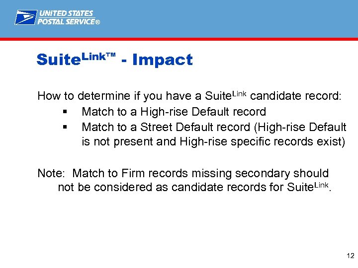 ® Suite. Link™ - Impact § CASS™ Developers • Will be included in all CASS certification tests • Must be included in software released to end user § MASS™ Developers • • Will be included in all MASS certification tests End Users required to certify using Suite. Link test data Required to spray new 11 -Digit barcode for suite number Required to spray suite number on mailpiece § End Users (CASS/MASS) • Mandatory for use in production environment • Suite number required to be appended to address printed on mailpiece in order to use ZIP+4® code 11