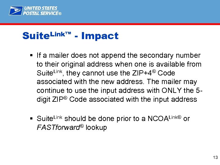 ® Suite. Link™ - Impact How to determine if you have a Suite. Link candidate record: § Match to a High-rise Default record § Match to a Street Default record (High-rise Default is not present and High-rise specific records exist) Note: Match to Firm records missing secondary should not be considered as candidate records for Suite. Link. 12