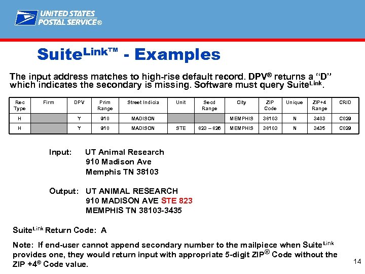 ® Suite. Link™ - Impact § If a mailer does not append the secondary number to their original address when one is available from Suite. Link, they cannot use the ZIP+4® Code associated with the new address. The mailer may continue to use the input address with ONLY the 5 digit ZIP® Code associated with the input address § Suite. Link should be done prior to a NCOALink® or FASTforward® lookup 13