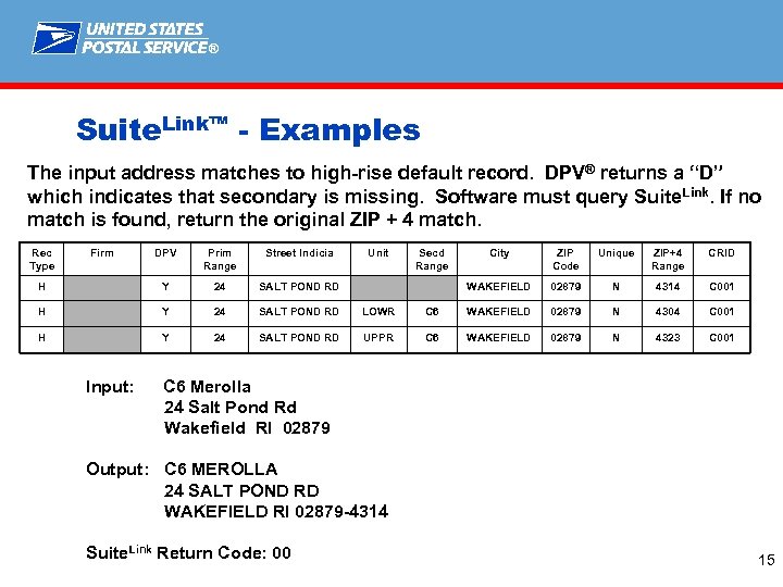 ® Suite. Link™ - Examples The input address matches to high-rise default record. DPV® returns a “D” which indicates the secondary is missing. Software must query Suite Link. Rec Type Firm DPV Prim Range Street Indicia H Y 910 MADISON Unit 823 – 826 City ZIP Code Unique ZIP+4 Range CRID MEMPHIS STE Secd Range 38103 N 3403 C 029 MEMPHIS 38103 N 3435 C 029 Input: UT Animal Research 910 Madison Ave Memphis TN 38103 Output: UT ANIMAL RESEARCH 910 MADISON AVE STE 823 MEMPHIS TN 38103 -3435 Suite. Link Return Code: A Note: If end-user cannot append secondary number to the mailpiece when Suite Link provides one, they would return input with appropriate 5 -digit ZIP ® Code without the ZIP +4® Code value. 14