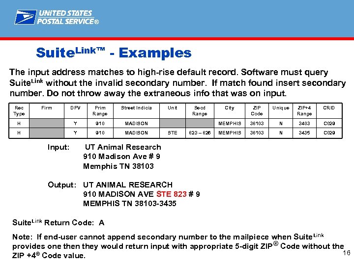 ® Suite. Link™ - Examples The input address matches to high-rise default record. Software must query Suite. Link without the invalid secondary number. If match found insert secondary number. Do not throw away the extraneous info that was on input. Rec Type Firm DPV Prim Range Street Indicia H Y 910 MADISON Unit 823 – 826 City ZIP Code Unique ZIP+4 Range CRID MEMPHIS STE Secd Range 38103 N 3403 C 029 MEMPHIS 38103 N 3435 C 029 Input: UT Animal Research 910 Madison Ave # 9 Memphis TN 38103 Output: UT ANIMAL RESEARCH 910 MADISON AVE STE 823 # 9 MEMPHIS TN 38103 -3435 Suite. Link Return Code: A Note: If end-user cannot append secondary number to the mailpiece when Suite Link provides one then they would return input with appropriate 5 -digit ZIP ® Code without the 16 ZIP +4® Code value.