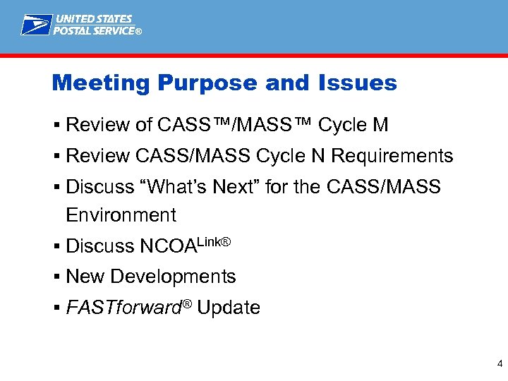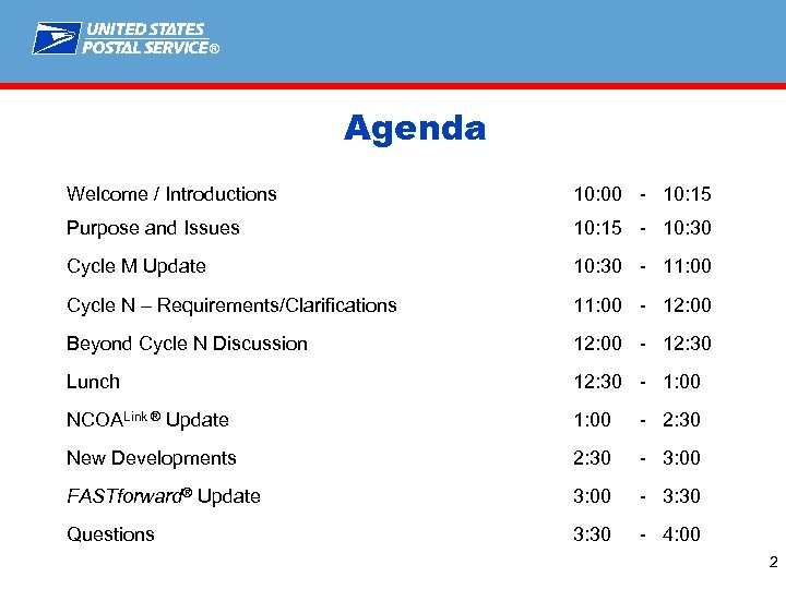 ® Agenda Welcome / Introductions 10: 00 - 10: 15 Purpose and Issues 10: 15 - 10: 30 Cycle M Update 10: 30 - 11: 00 Cycle N – Requirements/Clarifications 11: 00 - 12: 00 Beyond Cycle N Discussion 12: 00 - 12: 30 Lunch 12: 30 - 1: 00 NCOALink ® Update 1: 00 - 2: 30 New Developments 2: 30 - 3: 00 FASTforward® Update 3: 00 - 3: 30 Questions 3: 30 - 4: 00 2