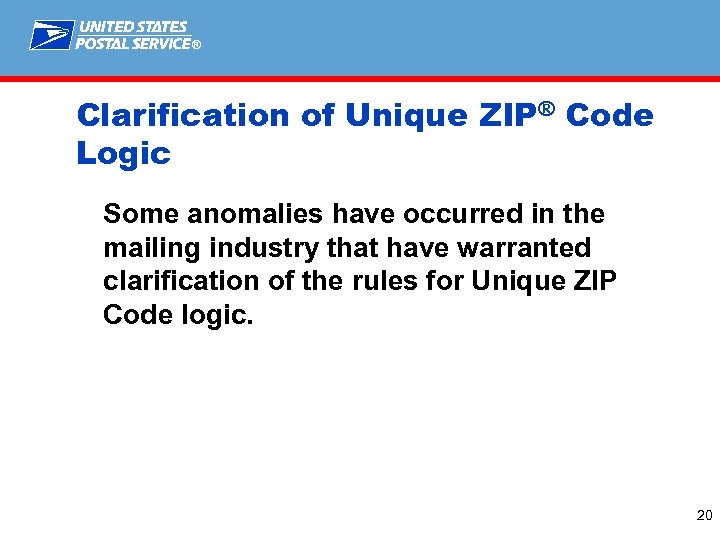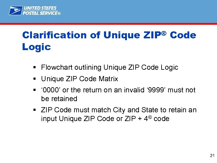 ® Clarification of Unique ZIP® Code Logic Some anomalies have occurred in the mailing industry that have warranted clarification of the rules for Unique ZIP Code logic. 20