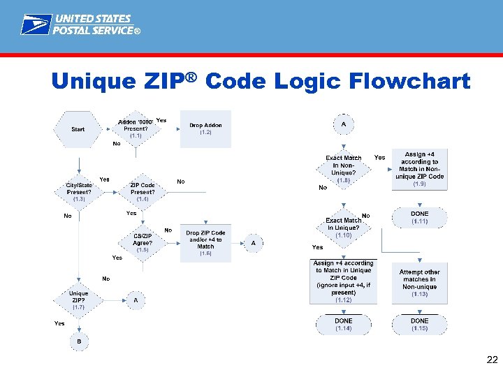 ® Clarification of Unique ZIP® Code Logic § Flowchart outlining Unique ZIP Code Logic § Unique ZIP Code Matrix § ‘ 0000’ or the return on an invalid ‘ 9999’ must not be retained § ZIP Code must match City and State to retain an input Unique ZIP Code or ZIP + 4® code 21