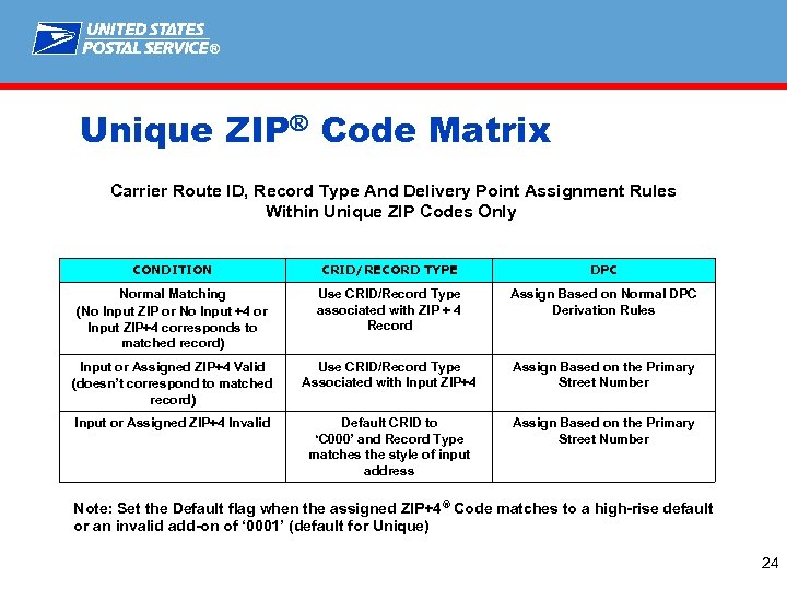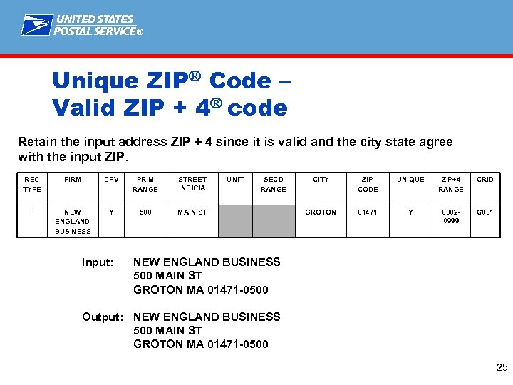 ® Unique ZIP® Code Matrix Carrier Route ID, Record Type And Delivery Point Assignment Rules Within Unique ZIP Codes Only CONDITION CRID/RECORD TYPE DPC Normal Matching (No Input ZIP or No Input +4 or Input ZIP+4 corresponds to matched record) Use CRID/Record Type associated with ZIP + 4 Record Assign Based on Normal DPC Derivation Rules Input or Assigned ZIP+4 Valid (doesn’t correspond to matched record) Use CRID/Record Type Associated with Input ZIP+4 Assign Based on the Primary Street Number Input or Assigned ZIP+4 Invalid Default CRID to ‘C 000’ and Record Type matches the style of input address Assign Based on the Primary Street Number Note: Set the Default flag when the assigned ZIP+4® Code matches to a high-rise default or an invalid add-on of ‘ 0001’ (default for Unique) 24