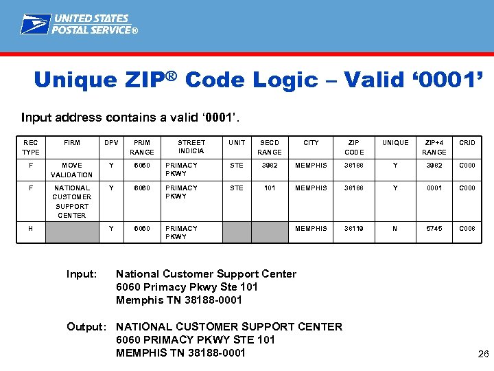 ® Unique ZIP® Code – Valid ZIP + 4® code Retain the input address ZIP + 4 since it is valid and the city state agree with the input ZIP. REC TYPE FIRM DPV PRIM RANGE STREET INDICIA F NEW ENGLAND BUSINESS Y 500 MAIN ST Input: Output: UNIT SECD RANGE CITY ZIP CODE UNIQUE ZIP+4 RANGE CRID GROTON 01471 Y 00020999 C 001 NEW ENGLAND BUSINESS 500 MAIN ST GROTON MA 01471 -0500 25