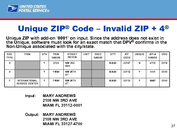 ® Unique ZIP® Code Logic – Valid ‘ 0001’ Input address contains a valid ‘ 0001’. REC TYPE FIRM DPV PRIM RANGE F MOVE VALIDATION Y 6060 F NATIONAL CUSTOMER SUPPORT CENTER Y Y H Input: STREET INDICIA UNIT SECD RANGE CITY ZIP CODE UNIQUE ZIP+4 RANGE CRID PRIMACY PKWY STE 3982 MEMPHIS 38188 Y 3982 C 000 6060 PRIMACY PKWY STE 101 MEMPHIS 38188 Y 0001 C 000 6060 PRIMACY PKWY MEMPHIS 38119 N 5745 C 008 National Customer Support Center 6060 Primacy Pkwy Ste 101 Memphis TN 38188 -0001 Output: NATIONAL CUSTOMER SUPPORT CENTER 6060 PRIMACY PKWY STE 101 MEMPHIS TN 38188 -0001 26