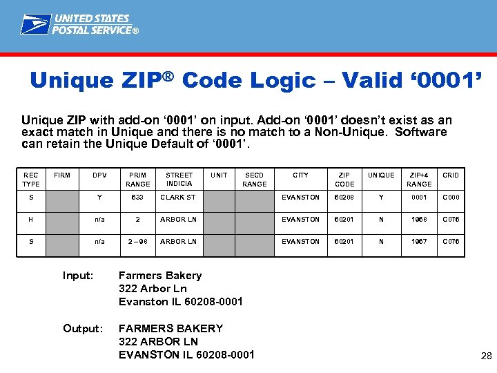 ® Unique ZIP® Code – Invalid ZIP + 4® Unique ZIP with add-on ‘ 0001’ on input. Since the address does not exist in the Unique, software must look for an exact match that DPV® confirms in the Non-Unique associated with the city/state. REC TYPE DPV PRIM RANGE S Y 2108 S Y Y F FIRM INTERNATIONAL SERVICE CENTER Input: STREET INDICIA UNIT SECD RANGE CITY ZIP CODE UNIQUE ZIP+4 RANGE CRID NW 3 RD AVE MIAMI 33127 N 4700 C 012 11698 NW 25 TH ST MIAMI 33112 Y 0001 C 000 11698 NW 25 TH ST MIAMI 33112 Y 9997 C 000 MARY ANDREWS 2108 NW 3 RD AVE MIAMI FL 33112 -0001 Output: MARY ANDREWS 2108 NW 3 RD AVE MIAMI FL 33127 -4700 27