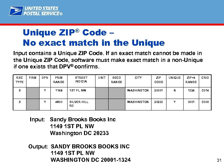 ® Unique ZIP® Code – City/State/ZIP do not correspond No correlation between city/state and ZIP Code – match to the city REC TYPE FIRM DPV PRIM RANGE STREET INDICIA S Y 1200 H Y 1200 P Y 2 UNIT SECD RANGE CITY ZIP CODE UNIQUE ZIP+4 RANGE CRID LOCUST ST DES MOINES 50391 Y 0001 C 000 LOCUST ST DES MOINES 50391 Y 9995 C 000 PO BOX WINCHESTER CENTER 06094 N 00010060 B 001 Input: Kings Tire Service PO Box 2 Winchester Center CT 50391 -0001 Output: KINGS TIRE SERVICE PO BOX 2 WINCHESTER CT 06094 -0002 30