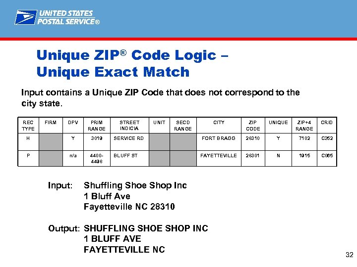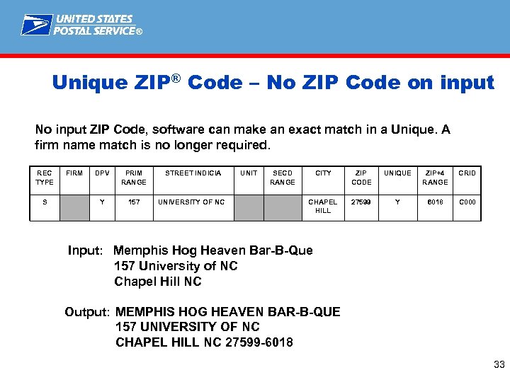 ® Unique ZIP® Code Logic – Unique Exact Match Input contains a Unique ZIP Code that does not correspond to the city state. REC TYPE FIRM DPV PRIM RANGE STREET INDICIA H Y 3019 SERVICE RD P n/a 4400 - 4498 BLUFF ST Input: UNIT SECD RANGE CITY ZIP CODE UNIQUE ZIP+4 RANGE CRID FORT BRAGG 28310 Y 7102 C 352 FAYETTEVILLE 28301 N 1915 C 065 Shuffling Shoe Shop Inc 1 Bluff Ave Fayetteville NC 28310 Output: SHUFFLING SHOE SHOP INC 1 BLUFF AVE FAYETTEVILLE NC 32