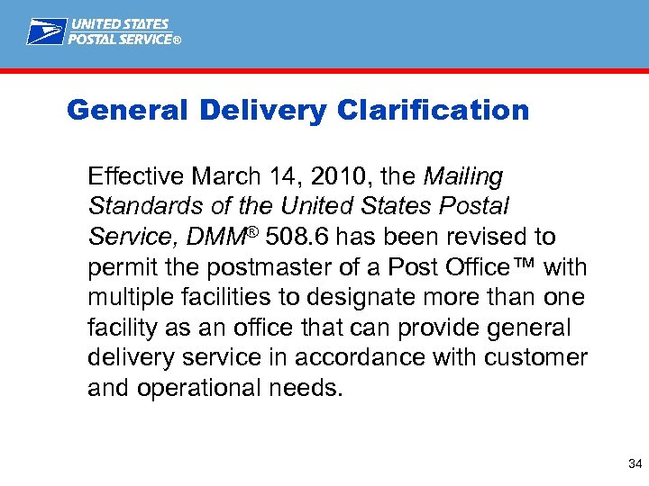 ® General Delivery Clarification Effective March 14, 2010, the Mailing Standards of the United States Postal Service, DMM® 508. 6 has been revised to permit the postmaster of a Post Office™ with multiple facilities to designate more than one facility as an office that can provide general delivery service in accordance with customer and operational needs. 34