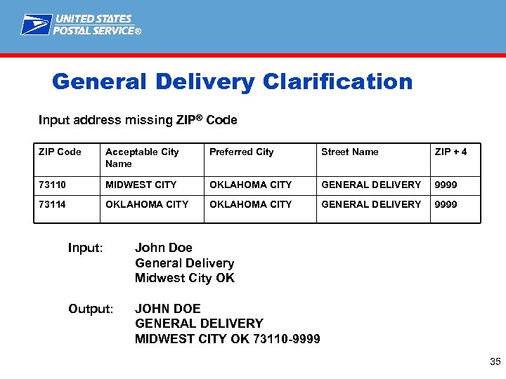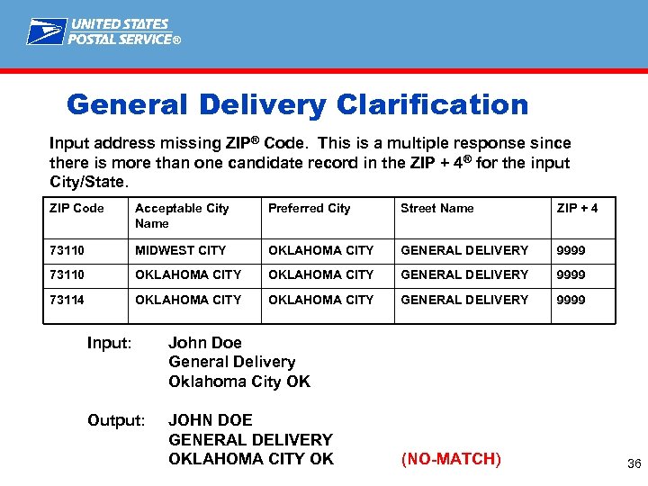 ® General Delivery Clarification Input address missing ZIP® Code ZIP Code Acceptable City Name Preferred City Street Name ZIP + 4 73110 MIDWEST CITY OKLAHOMA CITY GENERAL DELIVERY 9999 73114 OKLAHOMA CITY GENERAL DELIVERY 9999 Input: John Doe General Delivery Midwest City OK Output: JOHN DOE GENERAL DELIVERY MIDWEST CITY OK 73110 -9999 35