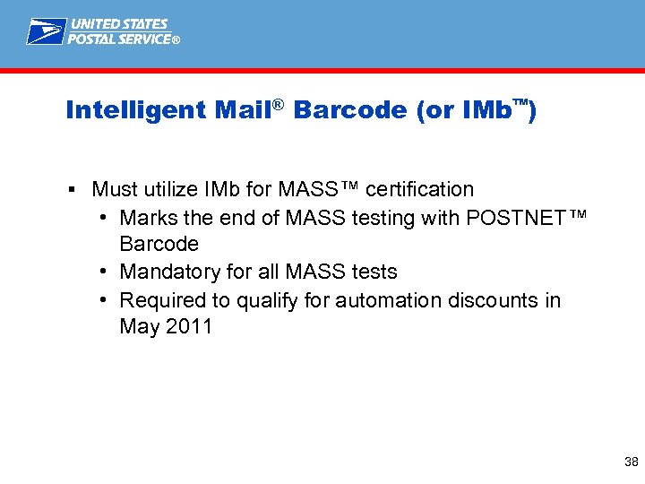 ® Intelligent Mail® Barcode (or IMb™) § Must utilize IMb for MASS™ certification • Marks the end of MASS testing with POSTNET™ Barcode • Mandatory for all MASS tests • Required to qualify for automation discounts in May 2011 38