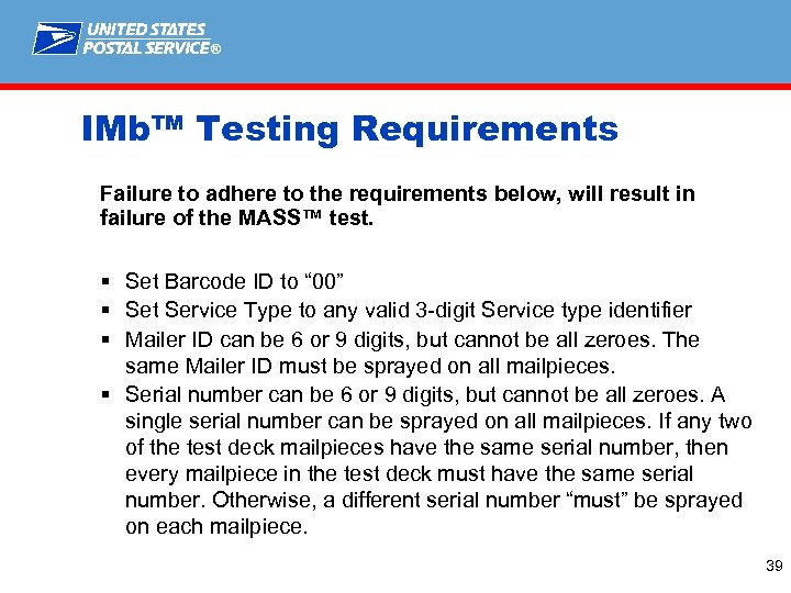 ® IMb™ Testing Requirements Failure to adhere to the requirements below, will result in failure of the MASS™ test. § Set Barcode ID to “ 00” § Set Service Type to any valid 3 -digit Service type identifier § Mailer ID can be 6 or 9 digits, but cannot be all zeroes. The same Mailer ID must be sprayed on all mailpieces. § Serial number can be 6 or 9 digits, but cannot be all zeroes. A single serial number can be sprayed on all mailpieces. If any two of the test deck mailpieces have the same serial number, then every mailpiece in the test deck must have the same serial number. Otherwise, a different serial number “must” be sprayed on each mailpiece. 39