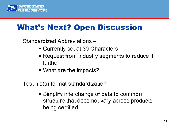 ® What’s Next? Open Discussion Standardized Abbreviations – § Currently set at 30 Characters § Request from industry segments to reduce it further § What are the impacts? Test file(s) format standardization § Simplify interchange of data to common structure that does not vary across products being certified 41