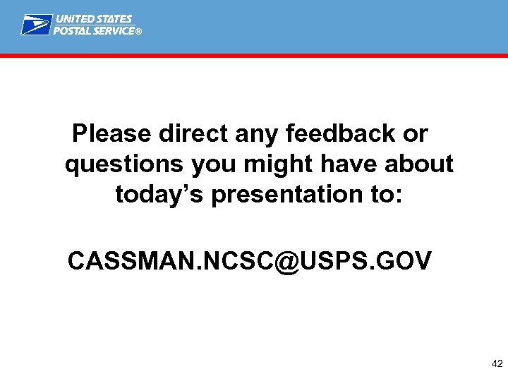 ® Please direct any feedback or questions you might have about today’s presentation to: CASSMAN. NCSC@USPS. GOV 42