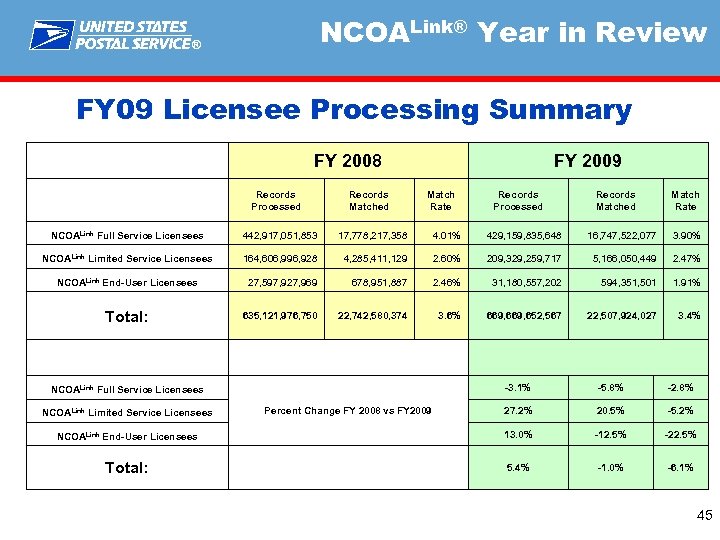 NCOALink® Year in Review ® FY 09 Licensee Processing Summary FY 2008 Records Processed Records Matched FY 2009 Match Rate Records Processed Records Matched Match Rate NCOALink Full Service Licensees 442, 917, 051, 853 17, 778, 217, 358 4. 01% 429, 159, 835, 648 16, 747, 522, 077 3. 90% NCOALink Limited Service Licensees 164, 606, 996, 928 4, 285, 411, 129 2. 60% 209, 329, 259, 717 5, 166, 050, 449 2. 47% NCOALink End-User Licensees 27, 597, 927, 969 678, 951, 887 2. 46% 31, 180, 557, 202 594, 351, 501 1. 91% Total: 635, 121, 976, 750 22, 742, 580, 374 3. 6% 669, 652, 567 22, 507, 924, 027 3. 4% -3. 1% -5. 8% -2. 8% 27. 2% 20. 5% -5. 2% NCOALink End-User Licensees 13. 0% -12. 5% -22. 5% Total: 5. 4% -1. 0% -6. 1% NCOALink Full Service Licensees NCOALink Limited Service Licensees Percent Change FY 2008 vs FY 2009 45
