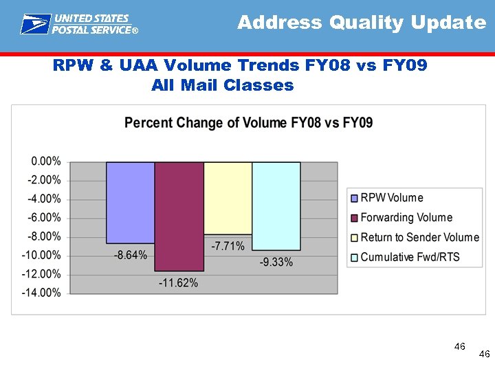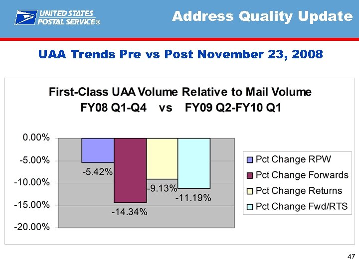 ® Address Quality Update RPW & UAA Volume Trends FY 08 vs FY 09 All Mail Classes 46 46
