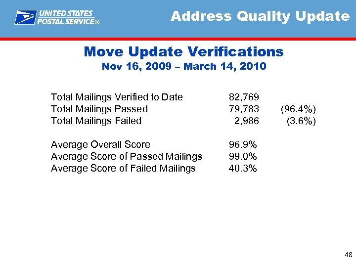 ® Address Quality Update Move Update Verifications Nov 16, 2009 – March 14, 2010 Total Mailings Verified to Date Total Mailings Passed Total Mailings Failed 82, 769 79, 783 2, 986 Average Overall Score Average Score of Passed Mailings Average Score of Failed Mailings 96. 9% 99. 0% 40. 3% (96. 4%) (3. 6%) 48