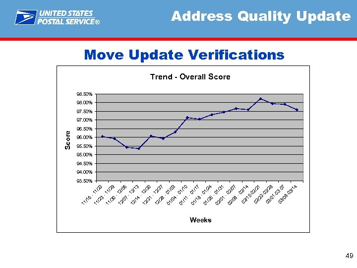 -1 1/ 22 -1 11 1/ 29 /3 0 -1 12 2/ 06 /0 7 -1 12 2/ 13 /1 4 -1 12 2/ 20 /2 1 -1 12 2/ 27 /2 8 -0 01 1/ 03 /0 4 -0 01 1/ 10 /1 1 -0 01 1/ 17 /1 8 -0 01 1/ 24 /2 5 -0 02 1/ 31 /0 1 -0 02 2/ 07 /0 8 -0 2/ 02 14 /1 502 02 /2 1 /2 202 03 /2 8 /0 103 03 -0 7 /0 803 /1 4 23 11 / 16 11 / Score ® Address Quality Update Move Update Verifications Trend - Overall Score 98. 50% 98. 00% 97. 50% 97. 00% 96. 50% 96. 00% 95. 50% 95. 00% 94. 50% 94. 00% 93. 50% Weeks 49