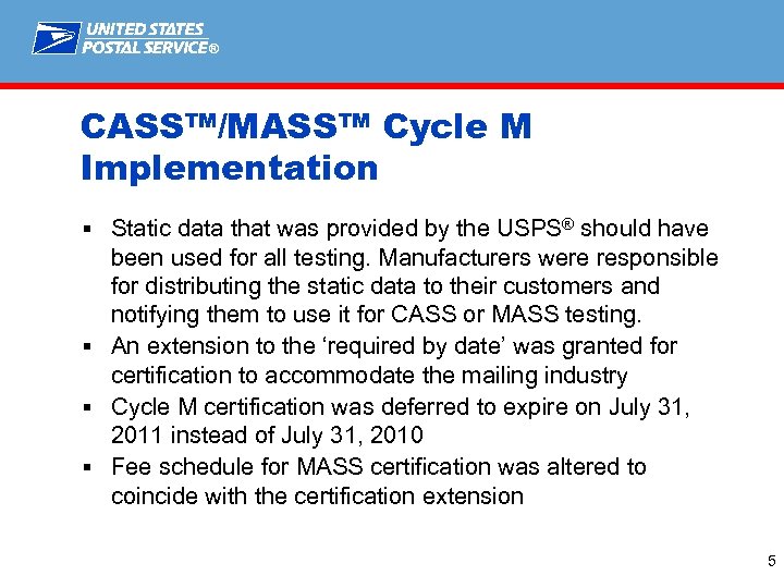 ® Meeting Purpose and Issues § Review of CASS™/MASS™ Cycle M § Review CASS/MASS Cycle N Requirements § Discuss “What’s Next” for the CASS/MASS Environment § Discuss NCOALink® § New Developments § FASTforward® Update 4