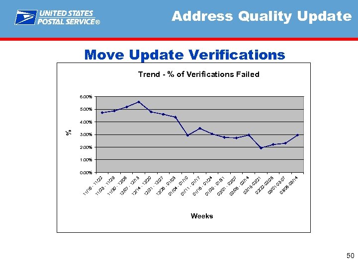 8 - /0 4 7 /1 03 -0 1 8 /2 02 03 1 - /0 03 03 2 - /2 02 14 07 2/ -0 31 24 1/ -0 17 10 1/ -0 27 20 03 1/ -0 2/ -1 13 2/ -1 29 06 2/ -1 22 1/ -1 5 - /1 02 8 /0 02 1 /0 02 5 /2 01 8 /1 01 1 /1 01 4 /0 01 8 /2 12 1 /2 12 4 /1 12 7 /0 12 0 /3 11 3 6 /2 11 /1 11 % ® Address Quality Update Move Update Verifications Trend - % of Verifications Failed 6. 00% 5. 00% 4. 00% 3. 00% 2. 00% 1. 00% 0. 00% Weeks 50
