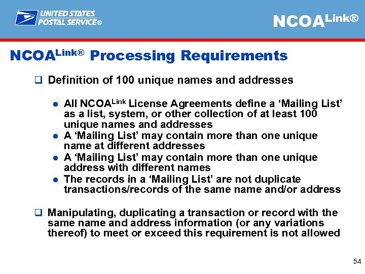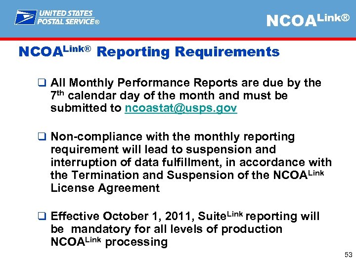 ® NCOALink® Reporting Requirements q All Monthly Performance Reports are due by the 7 th calendar day of the month and must be submitted to ncoastat@usps. gov q Non-compliance with the monthly reporting requirement will lead to suspension and interruption of data fulfillment, in accordance with the Termination and Suspension of the NCOALink License Agreement q Effective October 1, 2011, Suite. Link reporting will be mandatory for all levels of production NCOALink processing 53