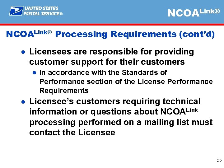 ® NCOALink® Processing Requirements (cont’d) ● Licensees are responsible for providing customer support for their customers ● In accordance with the Standards of Performance section of the License Performance Requirements ● Licensee’s customers requiring technical information or questions about NCOALink processing performed on a mailing list must contact the Licensee 55