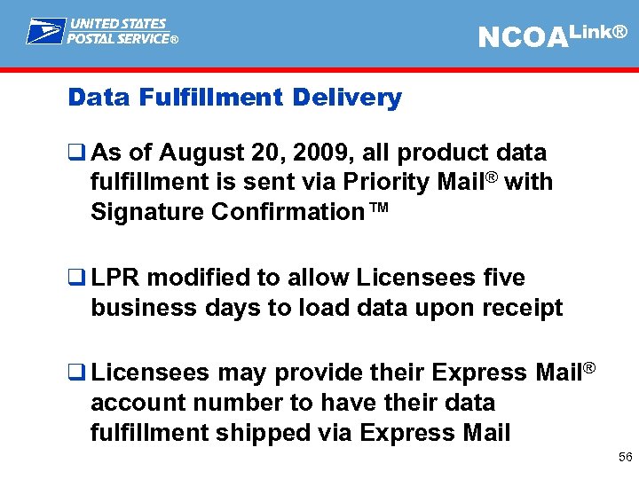 ® NCOALink® Data Fulfillment Delivery q As of August 20, 2009, all product data fulfillment is sent via Priority Mail® with Signature Confirmation™ q LPR modified to allow Licensees five business days to load data upon receipt q Licensees may provide their Express Mail® account number to have their data fulfillment shipped via Express Mail 56