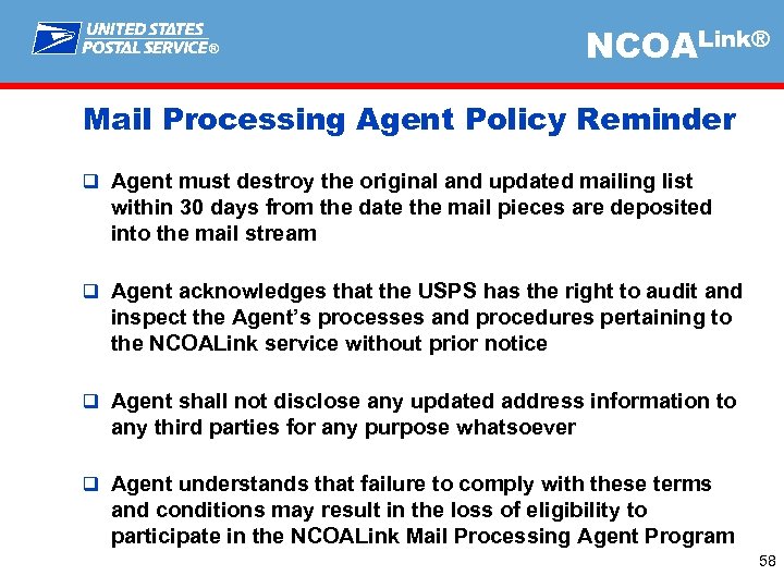 ® NCOALink® Mail Processing Agent Policy Reminder q MPA requires pre-approval prior to use q Agent must submit to the Full Service Provider Licensee a minimum of 100 unique names and addresses on each mailing list for NCOALink processing for acceptance, handling and delivery by the USPS q The Full Service Provider must only return the updated list to the Agent q Agent will not return updated address records to the original owner nor will the updated list be used for any purpose other than for mailing the original mail pieces from the original mailing list owner 57