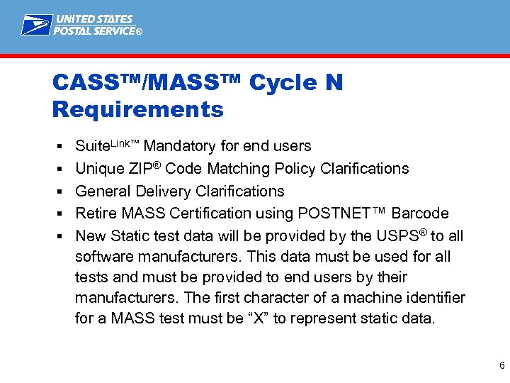 ® CASS™/MASS™ Cycle M Implementation § Static data that was provided by the USPS® should have been used for all testing. Manufacturers were responsible for distributing the static data to their customers and notifying them to use it for CASS or MASS testing. § An extension to the ‘required by date’ was granted for certification to accommodate the mailing industry § Cycle M certification was deferred to expire on July 31, 2011 instead of July 31, 2010 § Fee schedule for MASS certification was altered to coincide with the certification extension 5