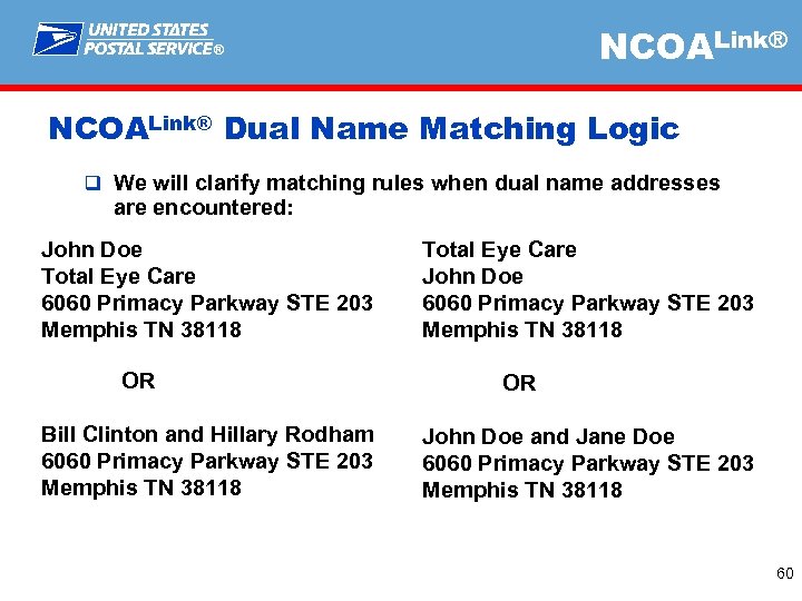 NCOALink® ® NCOALink® Dual Name Matching Logic q We will clarify matching rules when dual name addresses are encountered: John Doe Total Eye Care 6060 Primacy Parkway STE 203 Memphis TN 38118 OR Bill Clinton and Hillary Rodham 6060 Primacy Parkway STE 203 Memphis TN 38118 Total Eye Care John Doe 6060 Primacy Parkway STE 203 Memphis TN 38118 OR John Doe and Jane Doe 6060 Primacy Parkway STE 203 Memphis TN 38118 60