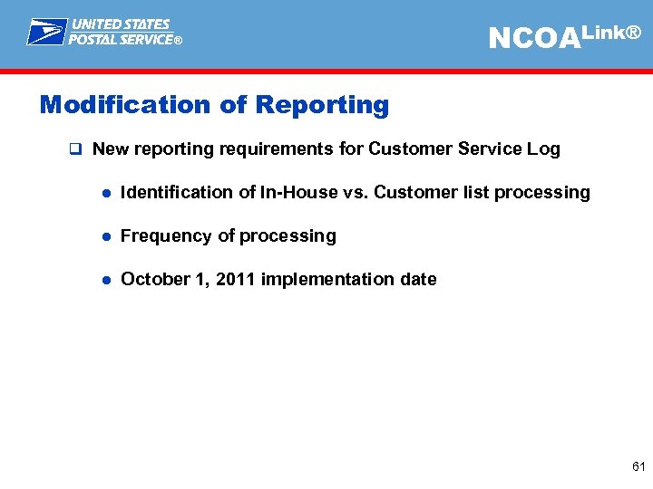 ® NCOALink® Modification of Reporting q New reporting requirements for Customer Service Log ● Identification of In-House vs. Customer list processing ● Frequency of processing ● October 1, 2011 implementation date 61