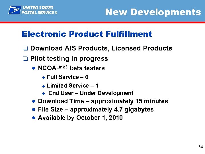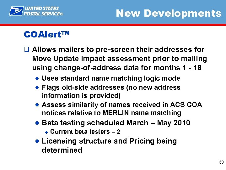 ® New Developments COAlert™ q Allows mailers to pre-screen their addresses for Move Update impact assessment prior to mailing using change-of-address data for months 1 - 18 ● Uses standard name matching logic mode ● Flags old-side addresses (no new address information is provided) ● Assess similarity of names received in ACS COA notices relative to MERLIN name matching ● Beta testing scheduled March – May 2010 u Current beta testers – 2 ● Licensing structure and Pricing being determined 63