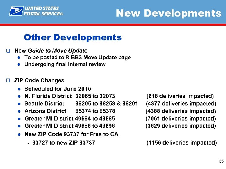 ® New Developments Other Developments q New Guide to Move Update ● To be posted to RIBBS Move Update page ● Undergoing final internal review q ZIP Code Changes ● ● ● ● Scheduled for June 2010 N. Florida District 32065 to 32073 (618 deliveries impacted) Seattle District 98205 to 98258 & 98201 (4377 deliveries impacted) Arizona District 85374 to 85378 (4388 deliveries impacted) Greater MI District 49684 to 49685 (7061 deliveries impacted) Greater MI District 49686 to 49696 (3629 deliveries impacted) New ZIP Code 93737 for Fresno CA - 93727 to new ZIP 93737 (1156 deliveries impacted) 65