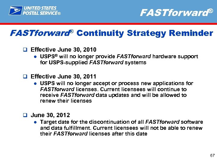 ® FASTforward® Continuity Strategy Reminder q Effective June 30, 2010 ● USPS® will no longer provide FASTforward hardware support for USPS-supplied FASTforward systems q Effective June 30, 2011 ● USPS will no longer accept or process new applications for FASTforward licenses. Current licensees will continue to receive FASTforward data updates and will be allowed to renew their licenses q June 30, 2012 ● Target date for the discontinuation of all FASTforward software and data fulfillment. Current licensees will not be able to renew their FASTforward licenses after this date 67