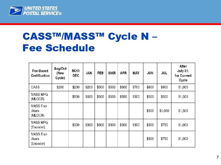 ® CASS™/MASS™ Cycle N Requirements § Suite. Link™ Mandatory for end users § Unique ZIP® Code Matching Policy Clarifications § General Delivery Clarifications § Retire MASS Certification using POSTNET™ Barcode § New Static test data will be provided by the USPS® to all software manufacturers. This data must be used for all tests and must be provided to end users by their manufacturers. The first character of a machine identifier for a MASS test must be “X” to represent static data. 6