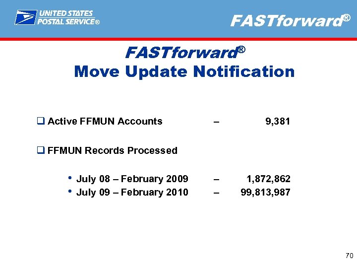 FASTforward® ® FASTforward® Move Update Notification q Active FFMUN Accounts – 9, 381 q FFMUN Records Processed • • July 08 – February 2009 – 1, 872, 862 July 09 – February 2010 – 99, 813, 987 70
