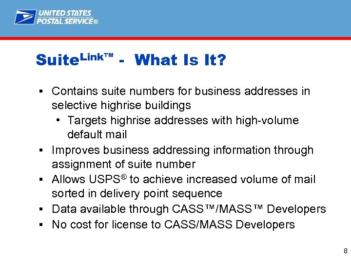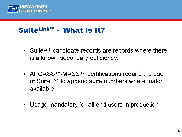 ® Suite. Link™ - What Is It? § Contains suite numbers for business addresses in § § selective highrise buildings • Targets highrise addresses with high-volume default mail Improves business addressing information through assignment of suite number Allows USPS® to achieve increased volume of mail sorted in delivery point sequence Data available through CASS™/MASS™ Developers No cost for license to CASS/MASS Developers 8