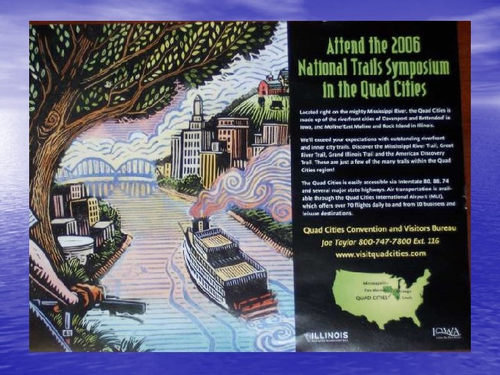 An Introduction To The Quad Cities • • 180 miles due west of Chicago 5 -city area ~ 350, 000 population Iowa – Bettendorf, Davenport Illinois – Rock Island, Moline, East Moline • Farm economy, former hub for agricultural equipment manufacture • Illinois QCs – 60+ miles of riverfront trail • Iowa QCs – 7 miles of riverfront trail, additional 10 miles inland • • • American Discovery Trail Mississippi River Trail 2006 National Trails Symposium, Davenport, Iowa Photo: Ken Larvenz