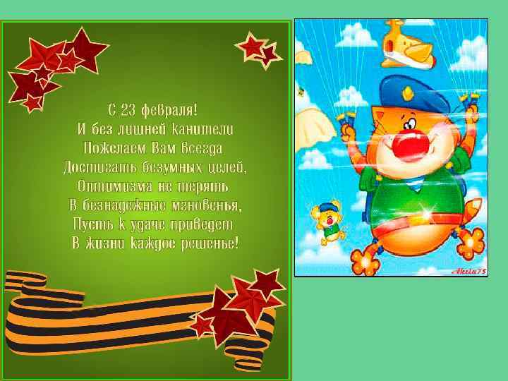 Прими, защитник, поздравленье! С тобой страна спокойно может спать. Пусть окружают позитив и восхищенье, А в жизни будет всё пускай на пять. Всё удается пусть мгновенно, Любовь и счастье крышу пусть снесут. Ты этого достоин, несомненно, Так пусть же окружат достаток и уют.