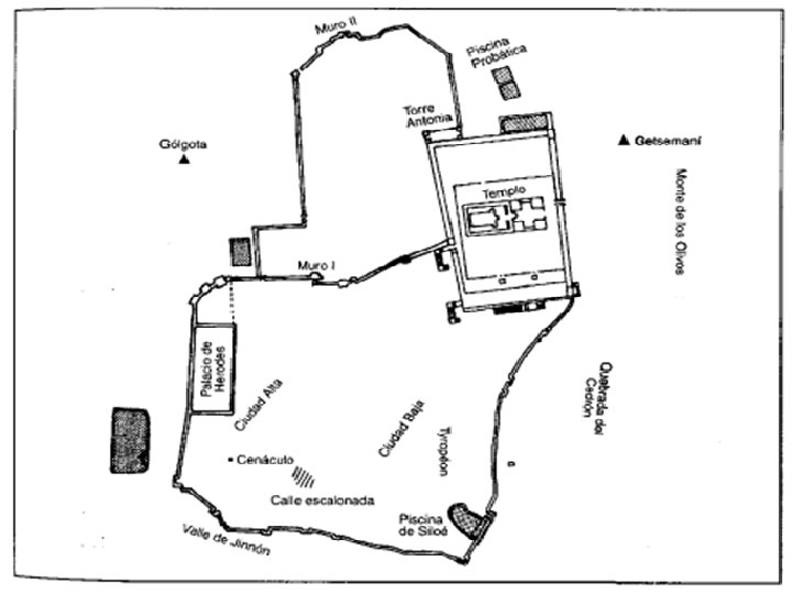 Las dimensiones de la ciudad eran pequeñas: mil quinientos metros de longitud y ochocientos de anchura. Ø Donde Jesús celebró la última cena se localiza al sur del palacio de Herodes. Ø La casa del sumo sacerdote estaba, en este barrio suroccidental. Ø Tras la cena, Jesús bajaría por una calle escalonada en dirección al valle del Cedrón, para llegar desde aquí a Getsemaní tras subir a la falda del Monte de los Olivos. Ø Tras su detención, lo condujeron por el mismo camino, en dirección contraria, para llevarlo a casa del sumo sacerdote. Ø El juicio de Jesús ante Pilato tuvo lugar en una plaza frente al palacio de Herodes. Ø En el Vía Crucis Jesús atravesaría la puerta al norte del palacio, en dirección al Gólgota. Ø La sepultura, tuvo lugar a treinta y cinco metros, al oeste del Gólgota. (J. Gonzalez Echegaray, Arqueología y evangelios, Verbo Divino, Estella 1994, p. 92).