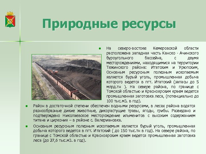 Природные ресурсы На северо-востоке Кемеровской области расположена западная часть Канско - Ачинского буроугольного бассейна, с двумя месторождениями, находящимися на территории Тяжинского района: Итатским и Урюпским, Основным ресурсным полезным ископаемым является бурый уголь, промышленная добыча которого ведется в пгт. Итатский (запасы до 5 млрд. тн ). На севере района, по границе с Томской областью и Красноярским краем ведется промышленная заготовка леса, (потенциально до 100 тыс. м 3. в год). Район в достаточной степени обеспечен водными ресурсами, в лесах района водятся разнообразные дикие животные, дикорастущие травы, ягоды, грибы. Разведано и подтверждено Николаевское месторождение ильменитов с высоким содержанием титана и циркония – в районе с. Валериановка. Основным ресурсным полезным ископаемым является бурый уголь, промышленная добыча которого ведется в пгт. Итатский ( до 150 тыс. тн в год). На севере района, по границе с Томской областью и Красноярским краем ведется промышленная заготовка леса (до 27, 6 тыс. м 3. в год). n n n