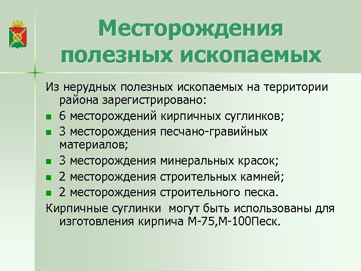Месторождения полезных ископаемых Из нерудных полезных ископаемых на территории района зарегистрировано: n 6 месторождений кирпичных суглинков; n 3 месторождения песчано-гравийных материалов; n 3 месторождения минеральных красок; n 2 месторождения строительных камней; n 2 месторождения строительного песка. Кирпичные суглинки могут быть использованы для изготовления кирпича М-75, М-100 Песк.