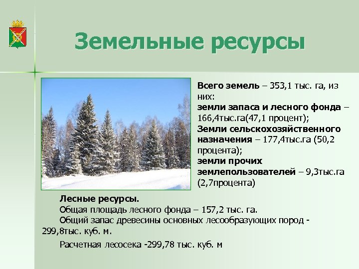 Земельные ресурсы Всего земель – 353, 1 тыс. га, из них: земли запаса и лесного фонда – 166, 4 тыс. га(47, 1 процент); Земли сельскохозяйственного назначения – 177, 4 тыс. га (50, 2 процента); земли прочих землепользователей – 9, 3 тыс. га (2, 7 процента) Лесные ресурсы. Общая площадь лесного фонда – 157, 2 тыс. га. Общий запас древесины основных лесообразующих пород 299, 8 тыс. куб. м. Расчетная лесосека -299, 78 тыс. куб. м