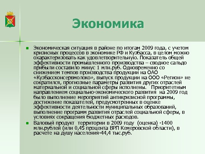 Экономика n n Экономическая ситуация в районе по итогам 2009 года, с учетом кризисных процессов в экономике РФ и Кузбасса, в целом можно охарактеризовать как удовлетворительную. Показатель общей эффективности промышленного производства – сводное сальдо прибыли составило минус 1 млн. руб. Одновременно со снижением темпов производства продукции на ОАО «Кузбассконсервмолоко» , выпуск продукции на ООО «Регион» не сократился, прогнозные параметры развития других отраслей материальной и социальной сферы исполнены. Приоритетным направлением социально-экономического развития на 2009 год было выполнение мероприятий антикризисной программы, достижение показателей, предусмотренных в оценке эффективности деятельности муниципальных образований, выполнение программ развития отраслей социальной сферы, в условиях сокращения бюджетных расходов. Валовый продукт территории в 2009 году (оценка) -1400 млн. рублей (или 0, 45 процента ВРП Кемеровской области), в расчете на душу населения-44, 4 тыс. руб.