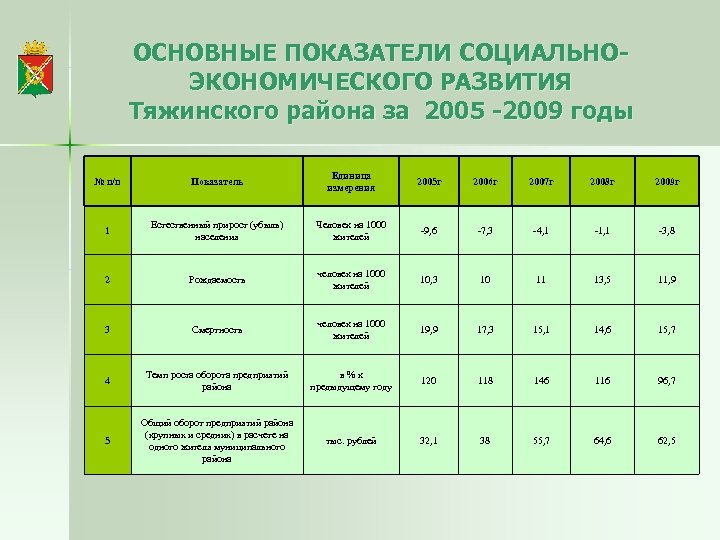 ОСНОВНЫЕ ПОКАЗАТЕЛИ СОЦИАЛЬНОЭКОНОМИЧЕСКОГО РАЗВИТИЯ Тяжинского района за 2005 -2009 годы № п/п Показатель Единица измерения 2005 г 2006 г 2007 г 2008 г 2009 г 1 Естественный прирост (убыль) населения Человек на 1000 жителей -9, 6 -7, 3 -4, 1 -1, 1 -3, 8 2 Рождаемость человек на 1000 жителей 10, 3 10 11 13, 5 11, 9 3 Смертность человек на 1000 жителей 19, 9 17, 3 15, 1 14, 6 15, 7 4 Темп роста оборота предприятий района в%к предыдущему году 120 118 146 116 96, 7 5 Общий оборот предприятий района (крупных и средних) в расчете на одного жителя муниципального района тыс. рублей 32, 1 38 55, 7 64, 6 62, 5