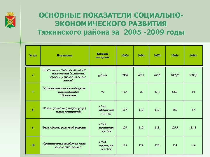 ОСНОВНЫЕ ПОКАЗАТЕЛИ СОЦИАЛЬНОЭКОНОМИЧЕСКОГО РАЗВИТИЯ Тяжинского района за 2005 -2009 годы № п/п Показатель Единица измерения 2005 г 2006 г 2007 г 2008 г 2009 г 6 Инвестиции в основной капитал за исключением бюджетных средств (в расчете на одного жителя) рублей 3906 4021 6736 7906, 7 5500, 3 7 Уровень дотационности бюджета муниципального образования % 72, 4 78 83, 5 88, 9 84 8 Объем продукции (товаров, услуг) малых предприятий в%к предыдуще му году 117 110 112 280 87 9 Темп оборота розничной торговли в%к предыдуще му году 107 110 118 103, 5 81, 8 10 Среднемесячная заработная плата одного работающего в%к предыдуще му году 125 127 128 124 114