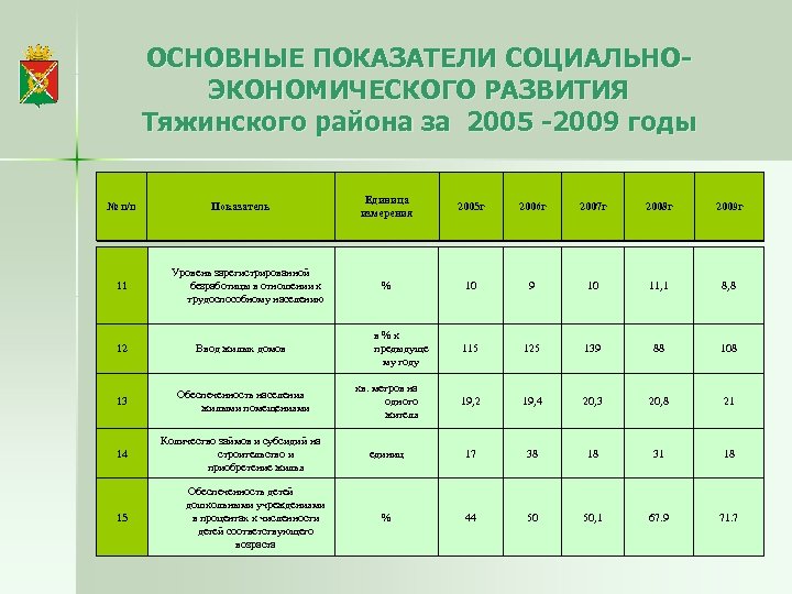 ОСНОВНЫЕ ПОКАЗАТЕЛИ СОЦИАЛЬНОЭКОНОМИЧЕСКОГО РАЗВИТИЯ Тяжинского района за 2005 -2009 годы № п/п 11 Показатель Уровень зарегистрированной безработицы в отношении к трудоспособному населению Единица измерения 2005 г 2006 г 2007 г 2008 г 2009 г % 10 9 10 11, 1 8, 8 115 125 139 88 108 в%к предыдуще му году 12 Ввод жилых домов 13 Обеспеченность населения жилыми помещениями кв. метров на одного жителя 19, 2 19, 4 20, 3 20, 8 21 14 Количество займов и субсидий на строительство и приобретение жилья единиц 17 38 18 31 18 % 44 50 50, 1 67. 9 71. 7 15 Обеспеченность детей дошкольными учреждениями в процентах к численности детей соответствующего возраста